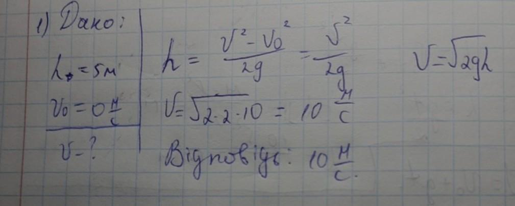 Пловець стрибнув із п’ятиметрової вишки. Початкова швидкість спортсмена дорівнює 0. Знайдіть швидкість плавця перед зануренням у воду? Опором повітря знехтуйте. Только нужно расписать решение