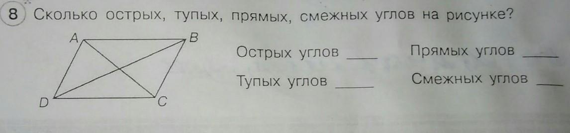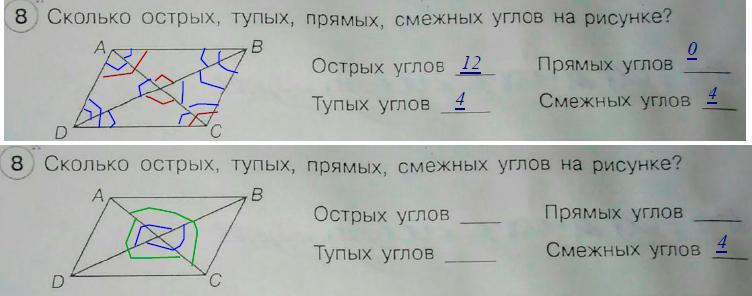 12 - острых, 4 - тупых, прямых нет, смежных -4.