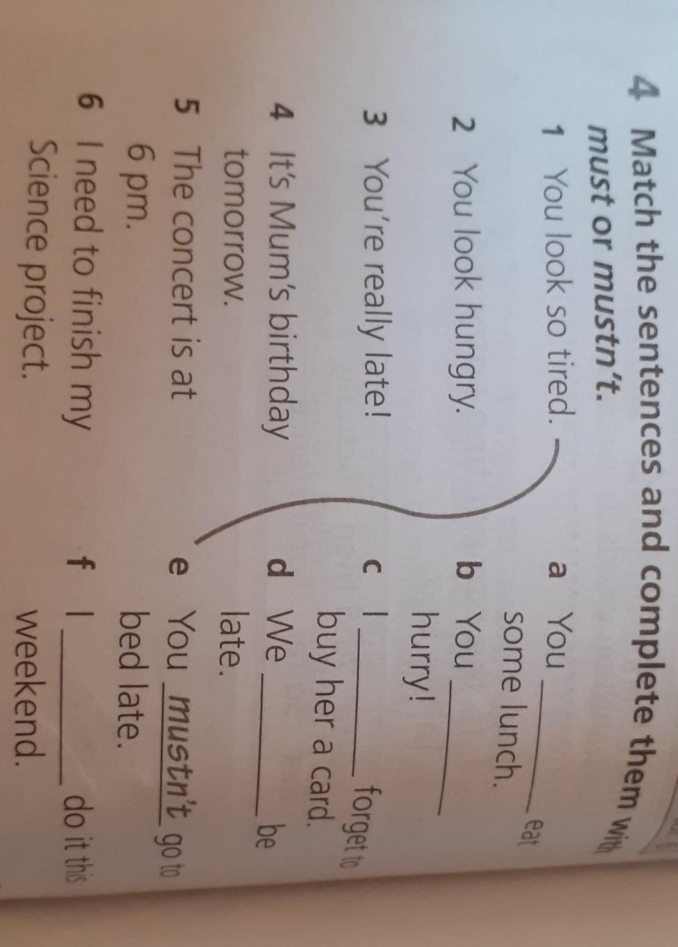 1 You look so tired. 2 You look hungry. 3 You're really late! 4 It's Mum's birthday tomorrow. a You some lunch. b You hurry! cl buy her a card. d We 5 The concert is at 6 pm. 6 I need to finish my f I. Science project. eat forget to weekend late. e You mustn't go to bed late. be do it this