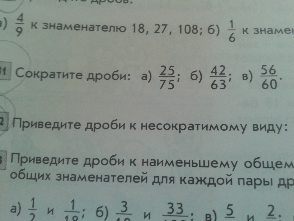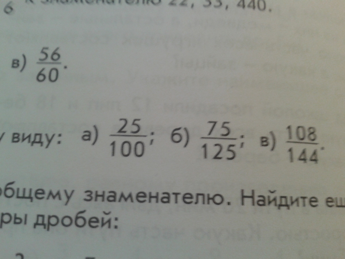 Приведите дроби к несократимому виду: 25/100 = 1/4; 75/125 = 3/5; 108/144=3/4.