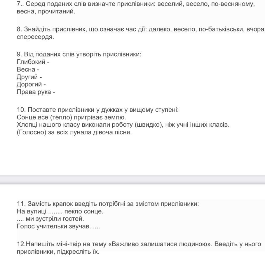 12.Напишіть міні-твір на тему «Важливо залишатися людиною». Введіть у нього прислівники, підкресліть їх.