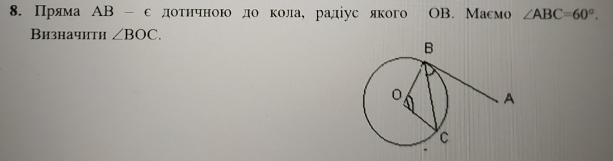 Радіус кола, проведений через точку дотику, перпендикулярний дотичній прямій. Отже, кут ОВА=90*. Звідси кут ОВС = 90-60=30*.