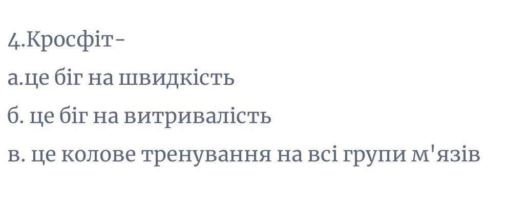 4.Кросфіт- а.це біг на швидкість б. це біг на витривалість в. це колове тренування на всі групи м'язів
