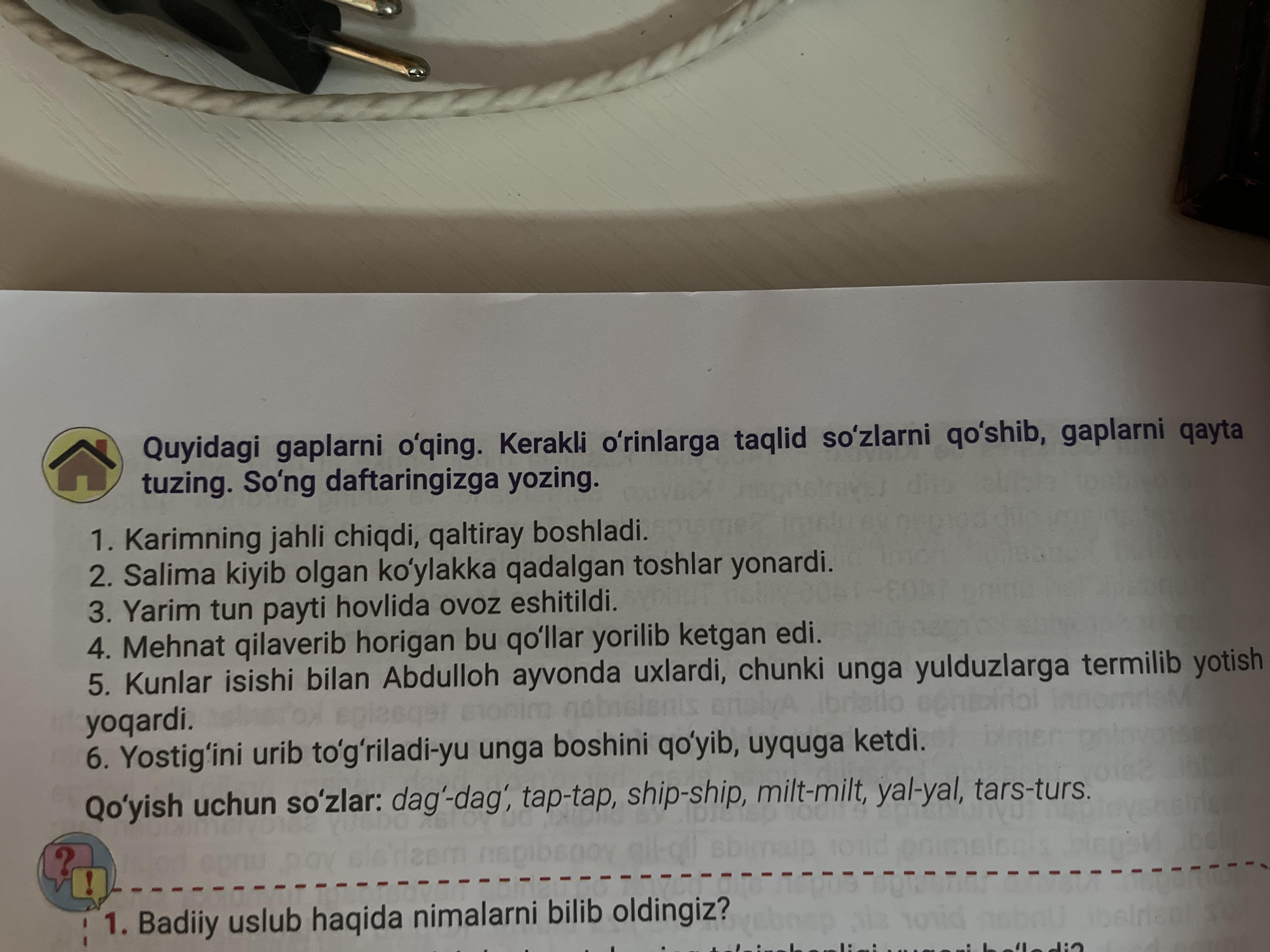 1.Karimning jahli chiqdi, daĝ-daĝ qaltiray boshladi. 2.yal-yal, ship-ship, 4tars-turs.