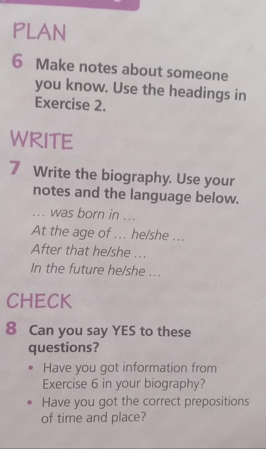 PLAN 6 Make notes about someone you know. Use the headings in Exercise 2. WRITE 7 Write the biography. Use your notes and the language below. was born in ... At the age of ... he/she ... After that he/she ... In the future he/she ... CHECK 8 Can you say YES to these questions? • Have you got information from Exercise 6 in your biography? • Have you got the correct prepositions of time and place?