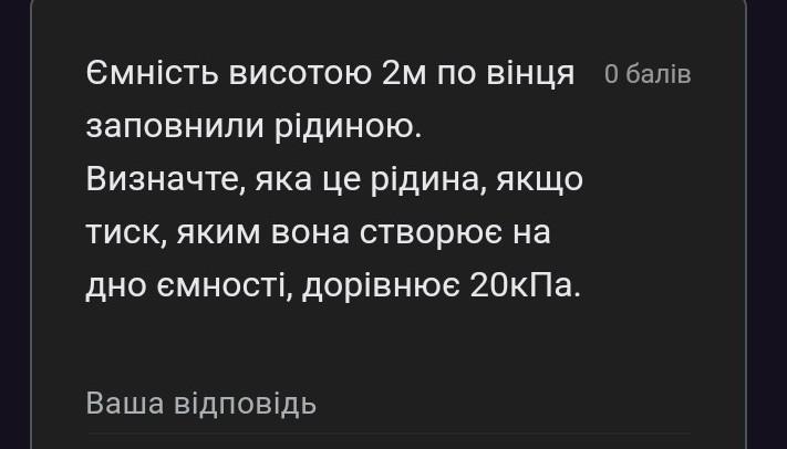 Ответ:За законом Паскаля тиск рідини на дно ємності залежить від щільності рідини, висоти стовпа рідини та прискорення вільного падіння:p = ρgh,де p - тиск рідини на дно ємності, ρ - щільність рідини, g - прискорення вільного падіння, h - висота рідинного стовпа.За даними умови, висота рідинного стовпа дорівнює 2 м, а тиск, яким рідина створює на дно ємності, дорівнює 20 кПа або 20 000 Па.Отже, ми можемо визначити щільність рідини за формулою:ρ = p/(gh) = 20 000 Па / (9,8 м/с² × 2 м) ≈ 1020 кг/м³.За цією щільністю можна зробити приблизний висновок про те, що це може бути вода або деякі типи органічних рідин, наприклад, етиловий спирт. Однак, щоб зробити точніший висновок, потрібно знати більше інформації про властивості рідини.