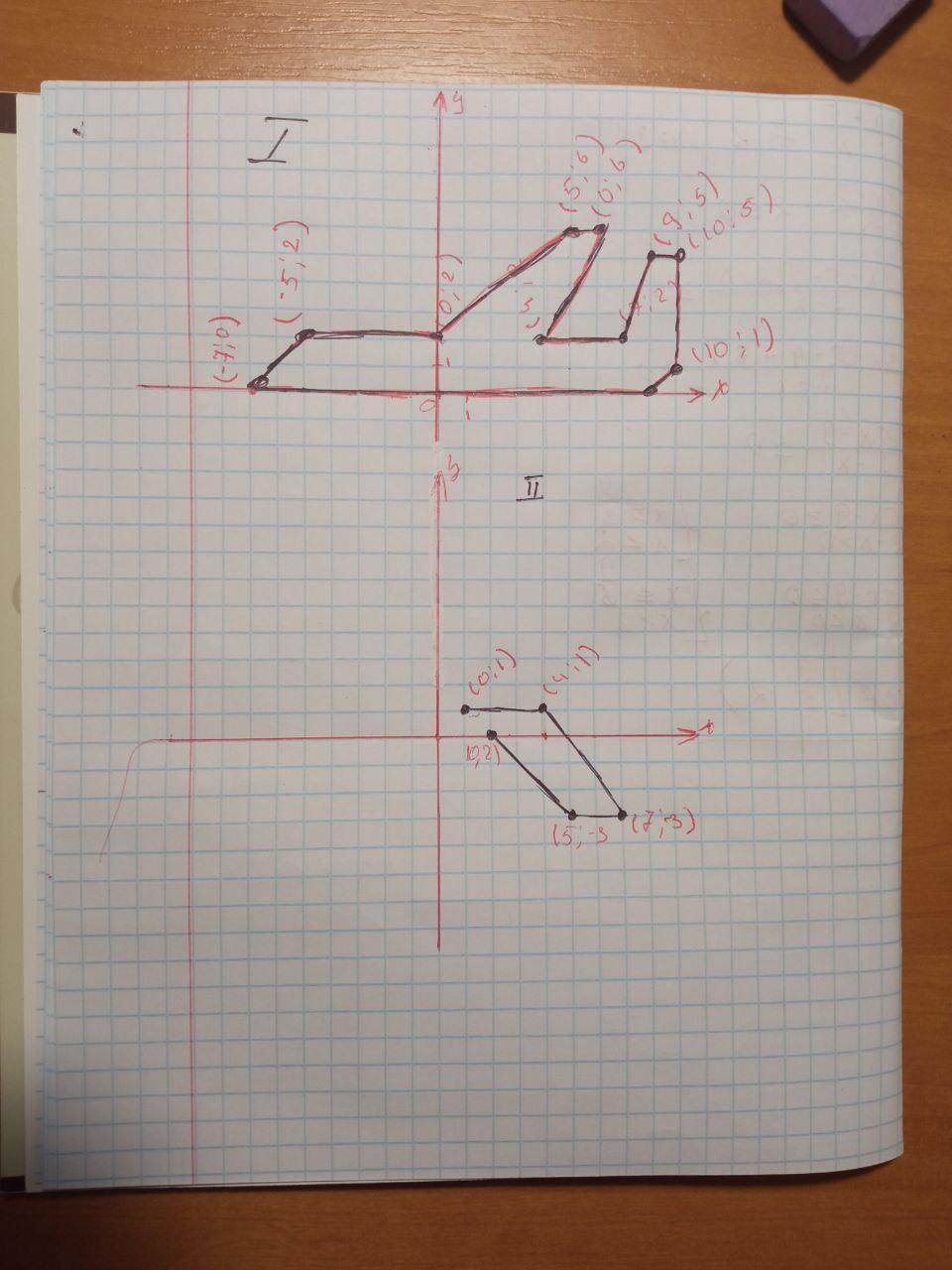 II. (0;1), (4; 1), (7; -3), (5; -3), (0; 2).