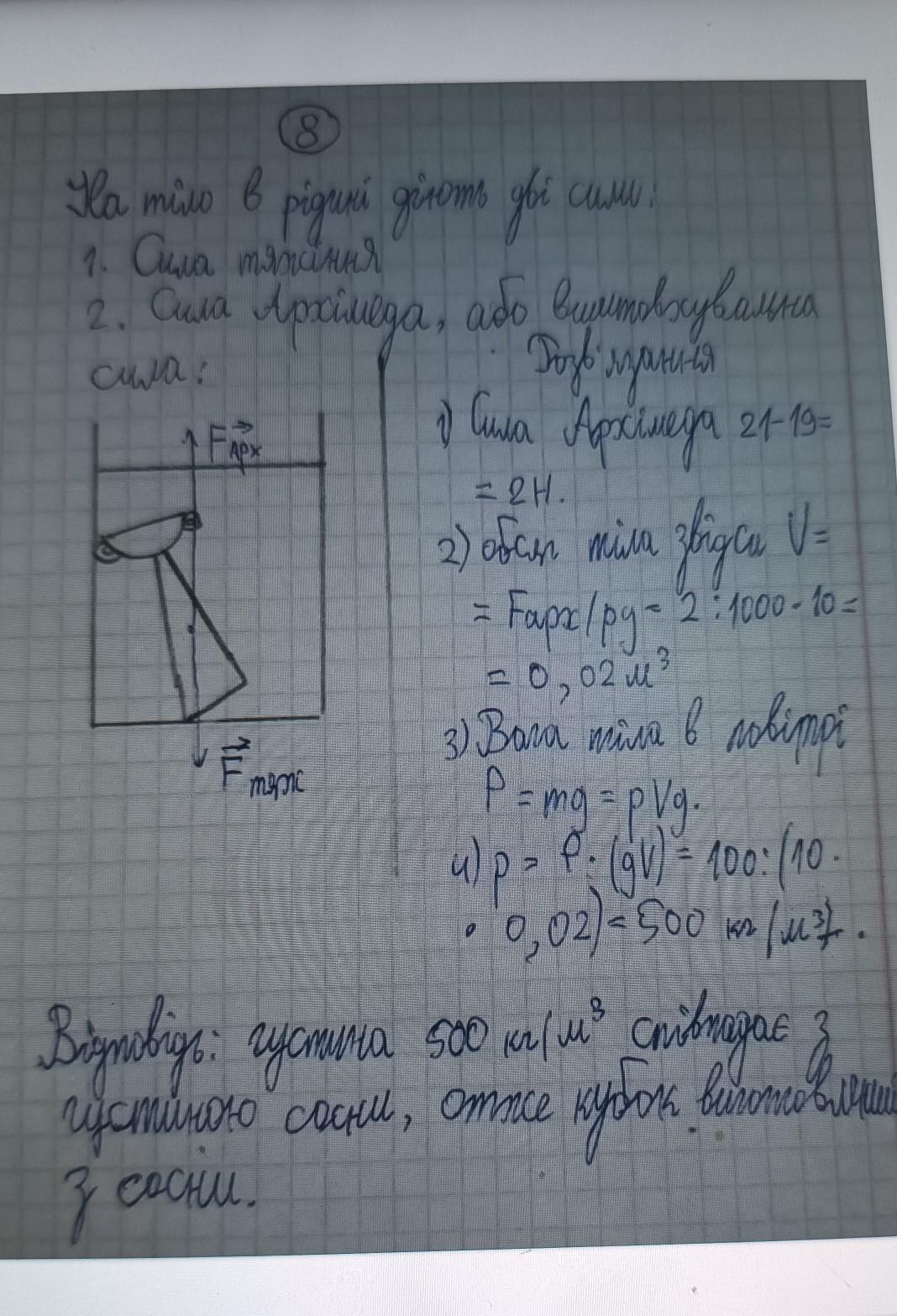 10. Обстежуючи руїни замка, семикласники знайшли красивий стародавній кубок. Кубок потемнів від часу, але допитливі семикласники, скориставшись тільки динамометром, легко визначили густину матеріалу кубка, а потім з якого металу він зроблений. Зробіть це і ви, вважаючи, що вага кубка в повітрі 21 Н, а у воді – 19 Н.