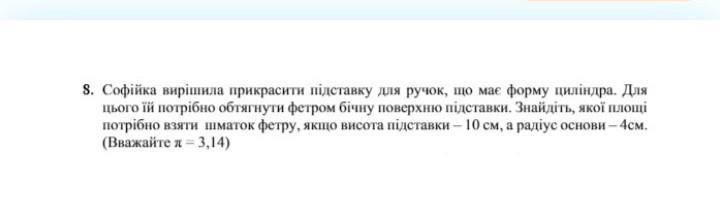 8. Софійка вирішила прикрасити підставку для ручок, що має форму циліндра. Для цього їй потрібно обтягнути фетром бічну поверхню підставки. Знайдіть, якоï площi потрібно взяти шматок фетру, якщо висота підставки-10 см, а радіус основи-4см. (Вважайте я = 3,14)