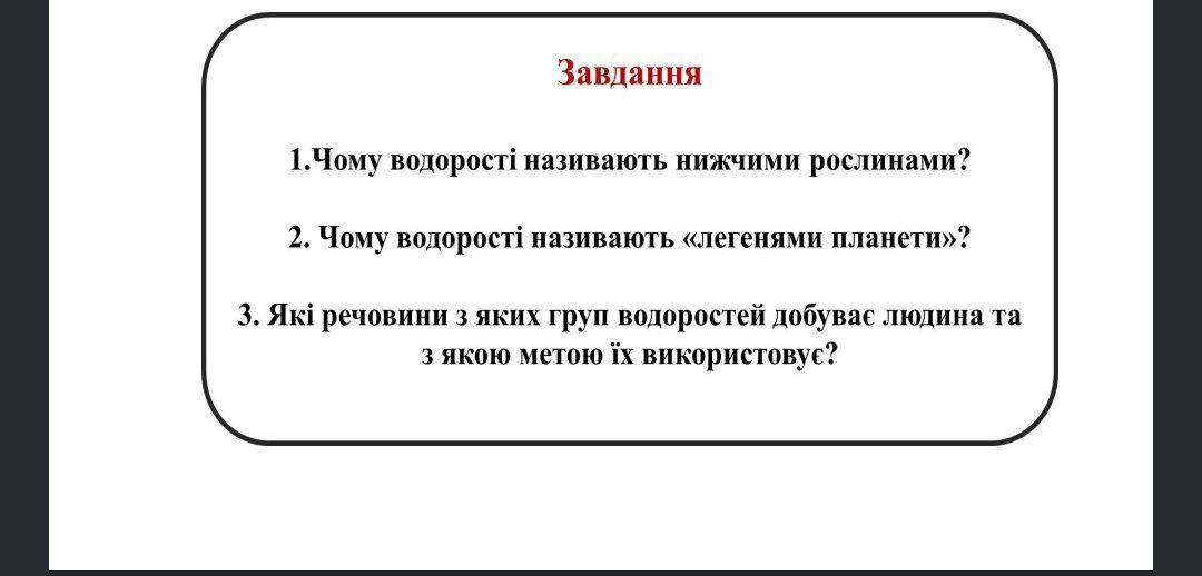 1-Водорості відносяться до нижчих рослин бо, головна риса, яка об’єднує нижчі рослини – відсутність диференціації тіла на тканини і органи, присутня і у них.