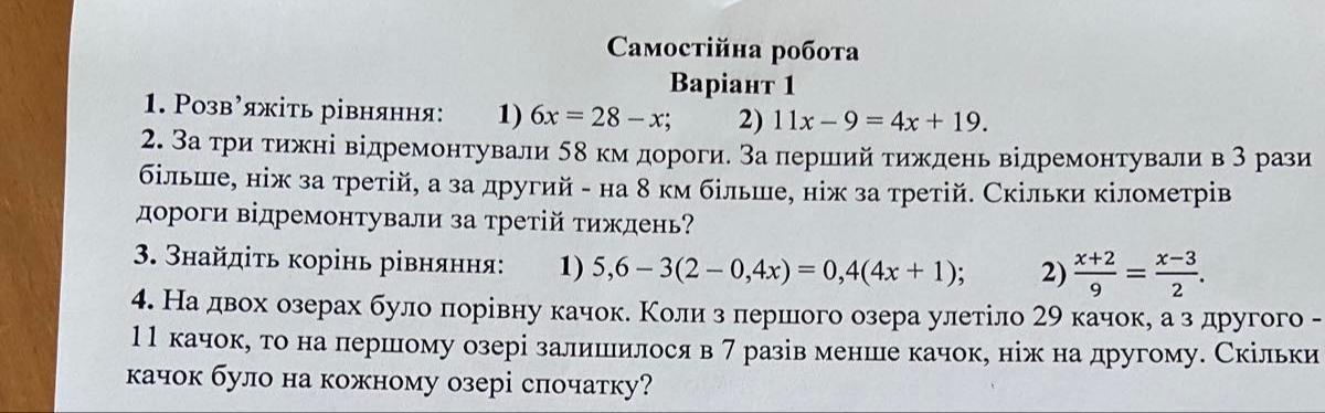 x+x+8+3x = 58 (где x - это 3яя неделя, x+8 - 2ая неделя, 3x - 1ая неделя, а 58 это вся дорога)