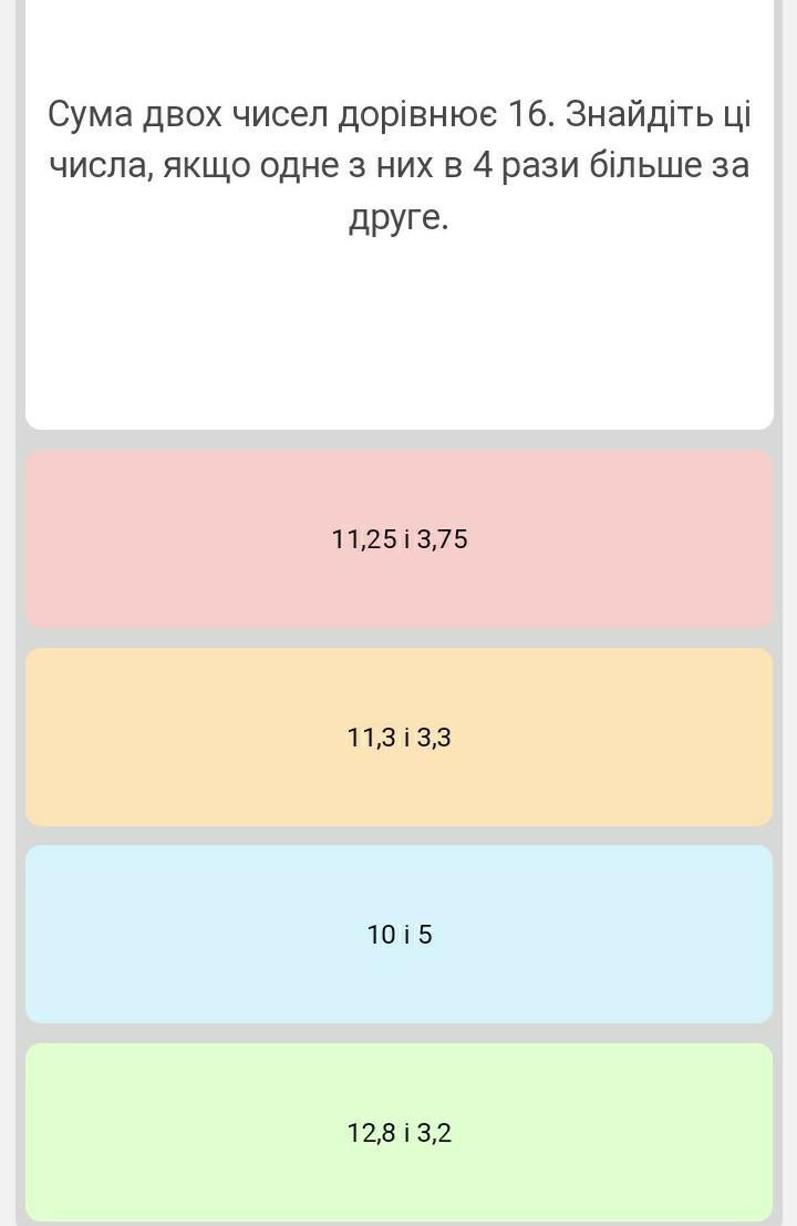 Сума двох чисел дорівнює 16. Знайдіть ці числа, якщо одне з них в 4 рази більше за друге.