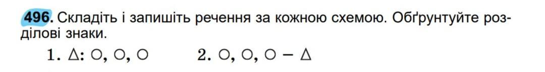 496. Складіть і запишіть речення за кожною схемою. Обґрунтуйте роз- ділові знаки. 1. ∆: 0, 0, О 2. 0, 0, 0 – Д помогите пожалуйста, дам 70 баллов