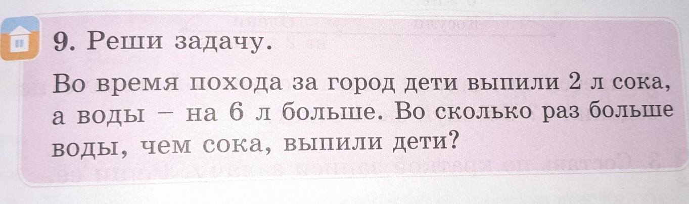 9. Реши задачу. Во время похода за город дети выпили 2 л сока, - а воды - на 6 л больше. Во сколько раз больше воды, чем сока, выпили дети? ПОМОГИТЕ ПОЖАЛУЙСТА ВЫПОЛНИТЬ ЗАДАЧУ УСЛОВИЯ