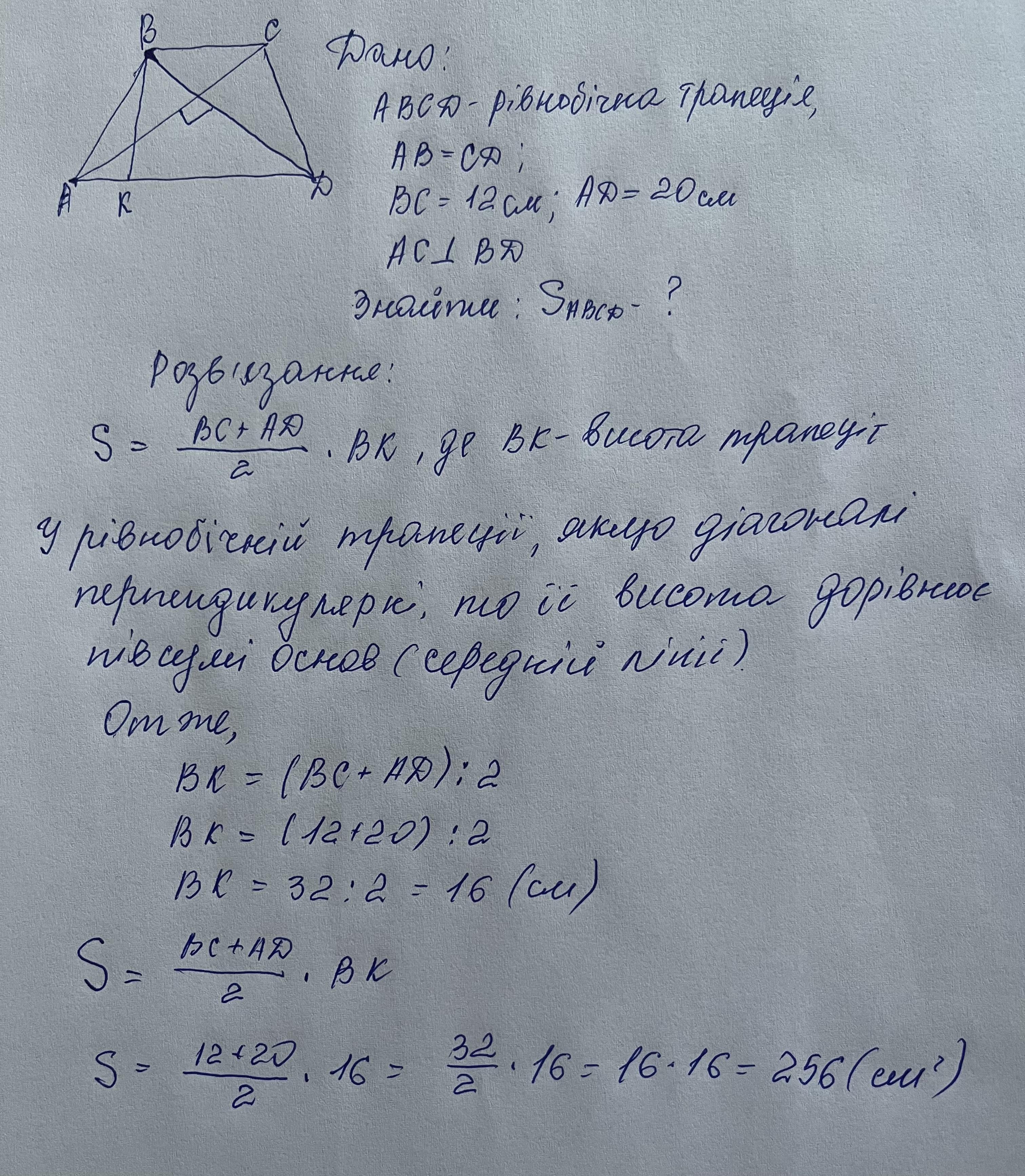 Доброго дня! Допоможіть мені будь ласочка з геометрією. Дуже прошу вирішити задачу з дано, малюнком та самим розв'язанням. Знайдіть площу рівнобічної трапеції, діагоналі якої перпендикулярні, а основи дорівнюють 12 см і 20 см