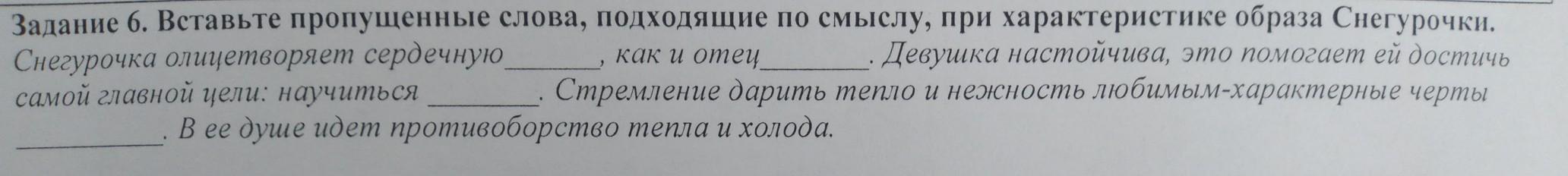 4. «Попляшите, согрейтесь!» Г) Риторическое восклицание Задание 6. Вставьте пропущенные слова, подходящие по смыслу, при характеристике образа Снегурочки. Снегурочка олицетворяет сердечную самой главной цели: научиться В ее душе идет противоборство тепла и холода. как и отец Девушка настойчива, это помогает ей достичь Стремление дарить тепло и нежность любимым-характерные черты