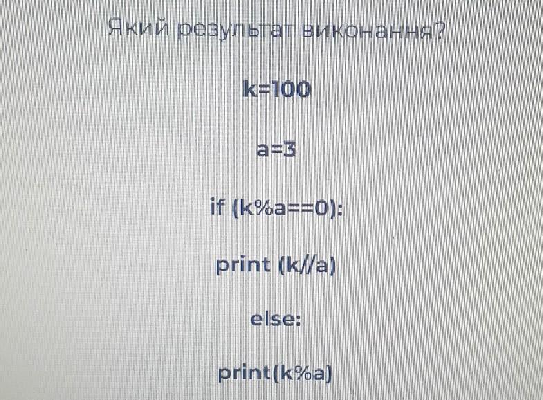 В данном фрагменте кода происходит проверка, делится ли число k на a без остатка (k % a == 0). Если это условие истинно (True), то на экран выводится результат целочисленного деления k на a (k // a), а если условие ложно (False), то выводится остаток от деления k на a (k % a).