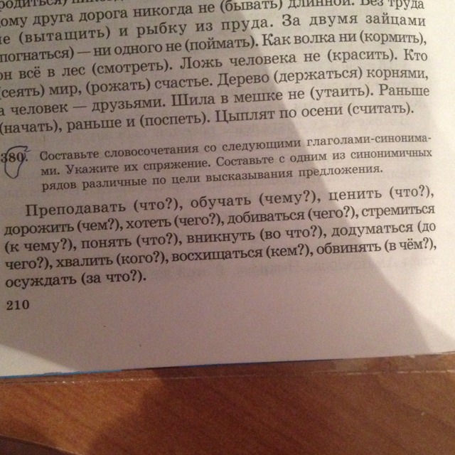 Преподавать математику, обучать наукам, ценить доброту, дорожить дружбой, добиваться успеха, стремиться к цели, понять материал, вникнуть в суть, додуматься до решения, хвалить ученика, восхищаться кумиром, осуждать за списывание
