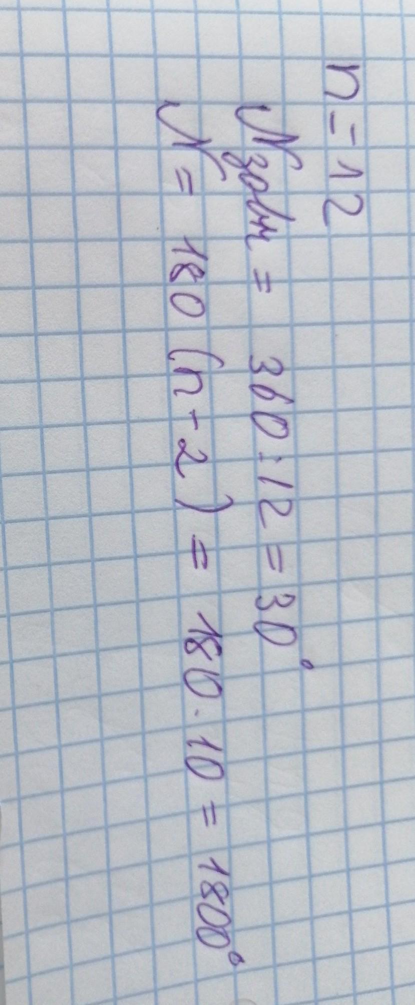 Знайти градусну міру внутрішнього і зовнішнього кутів правильного многокутника, якщо кількість сторiн дорiвнює: n=12
