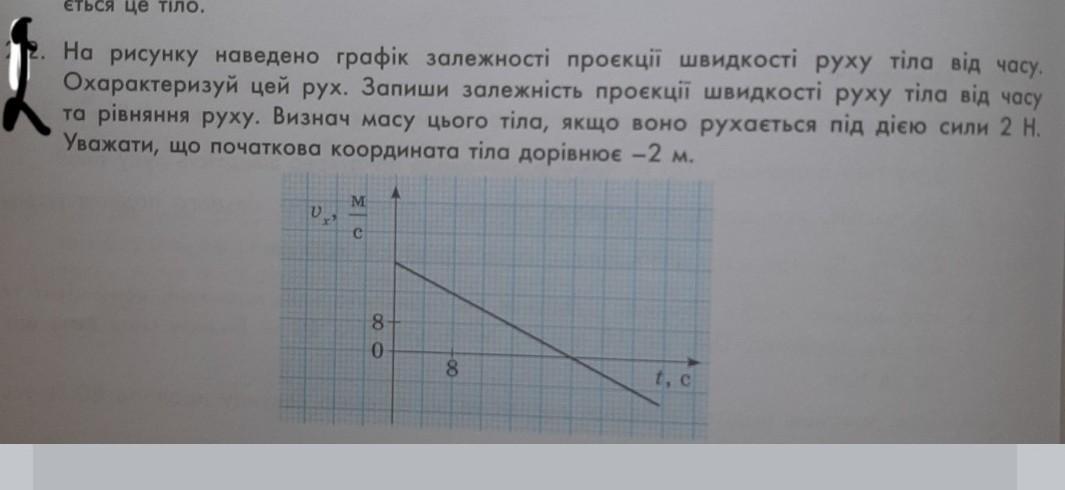 На рисунку наведено графік залежності проекції швидкості руху тіла від часу Охарактеризуй цей рух. Запиши залежність проекцiï швидкості руху тіла від часу та рiвняння руху. Визнач масу цього тіла, якщо воно рухається пiд дiєю сили 2 н. Уважати, що початкова координата тiла дорівнює -2 м.