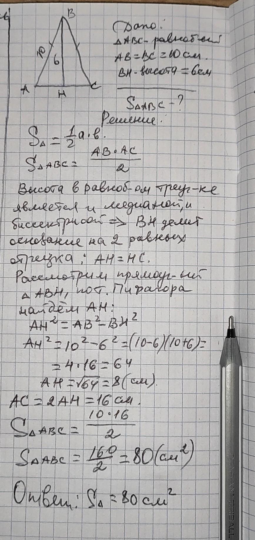 В рівнобедреному трикутнику бічна сторона дорівнює 10 см, а висота, що проведена до основи 6 см. Знайти площу трикутника