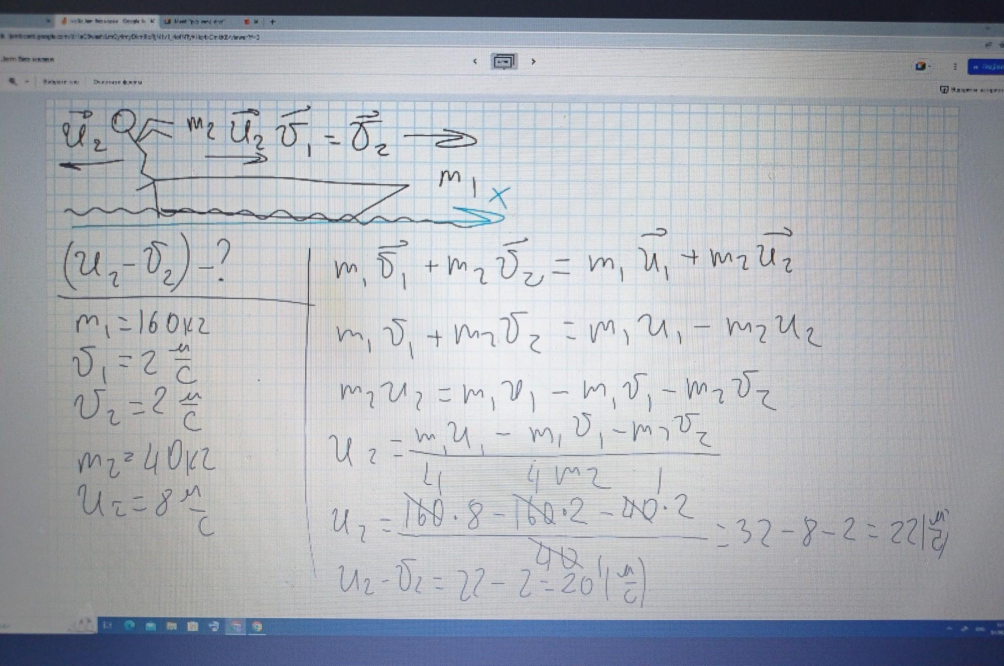 Човен масою 160 кг рухається зі швидкістю 2 м/с. 3 корми цього човна в бік, протилежний напрямку його руху, горизонтально вистрибує дівчина масою 40 кг,зі швидкістю 8м/с.На скільки збільшується швидкість човна після стрибка дівчини?