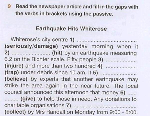 помогите пожалуйста!9 Read the newspaper article and fill in the gaps with the verbs in brackets using the passive. Earthquake Hits Whiterose Whiterose's city centre 1)......... (seriously/damage) yesterday morning when it (hit) by an earthquake measuring 2). 6.2 on the Richter scale. Fifty people 3) (injure) and more than two hundred 4) (trap) under debris since 10 am. It 5) (believe) by experts that another earthquake may strike the area again in the near future. The local council announced this afternoon that money 6)..... .......... (give) to help those in need. Any donations to charitable organisations 7) (collect) by Mrs Randall on Monday from 9:00-5:00. *****
