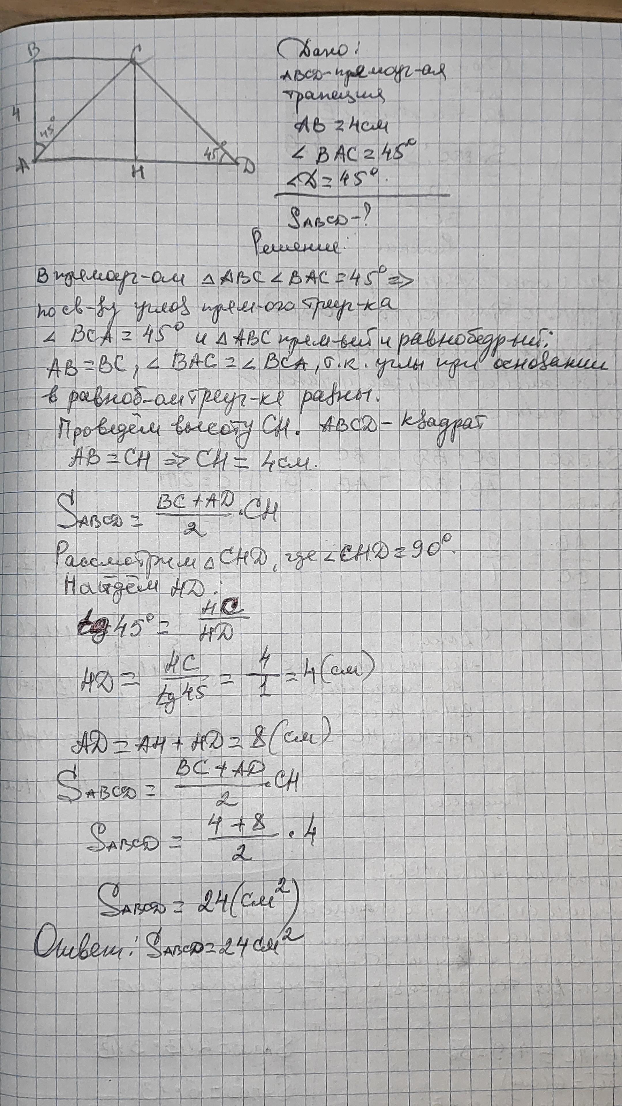 у прямокутній трапеції менша бічна сторона дорівнює 4см й утворює з меншою діагоналлю кут 45г радусів гострий кут трапеції також дорівнює 45 градусів знайдіть площу трапеції