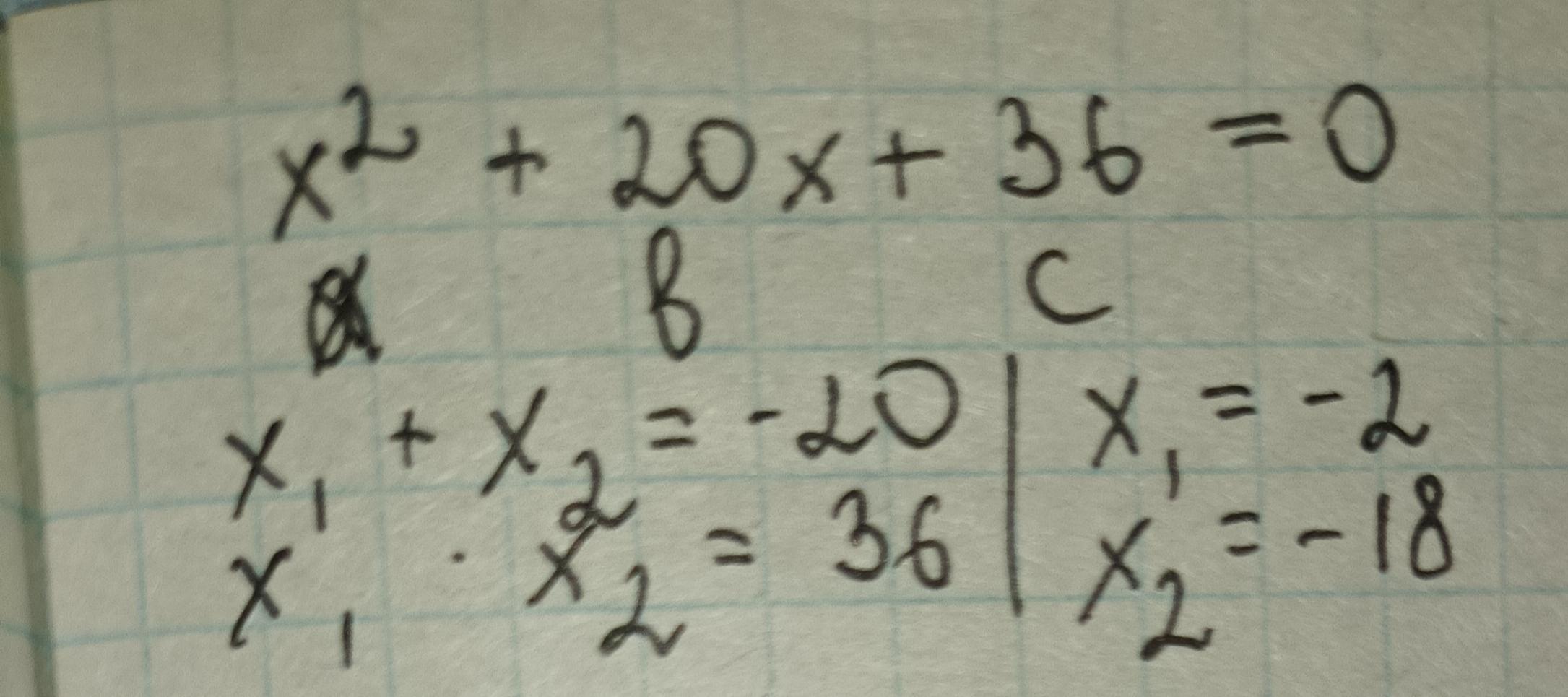 x₁,₂ = (-20 ± √(20² - 4×1×36)) / 2×1
