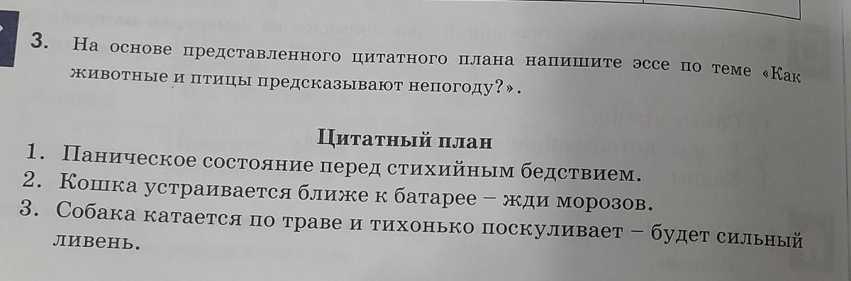 3. На основе представленного питатного плана напишите эссе по теме «Kaк животные и птицы предсказывают непогоду?». Цитатный план