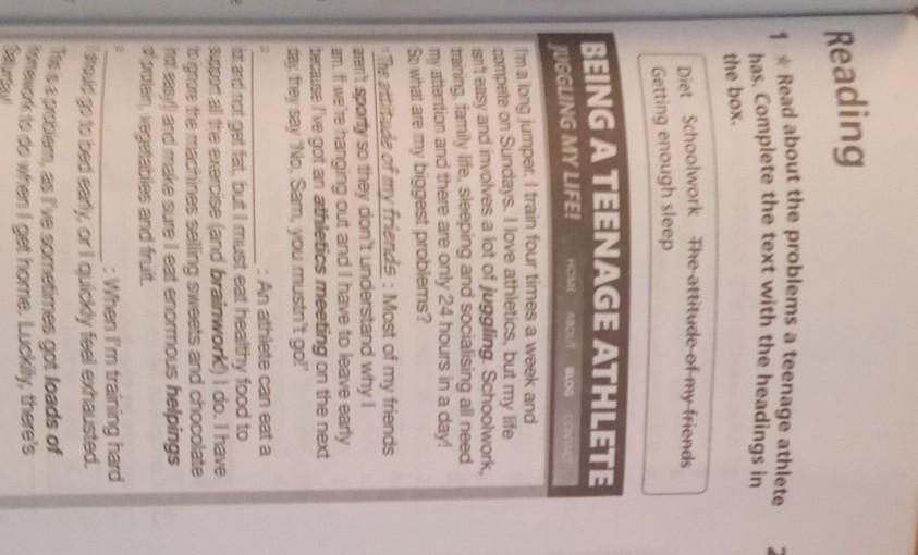 1* Read about the problems a teenage athlete has. Complete the text with the headings in the box. Diet Schoolwork The attitude of my friends Getting enough sleep помогите плисс