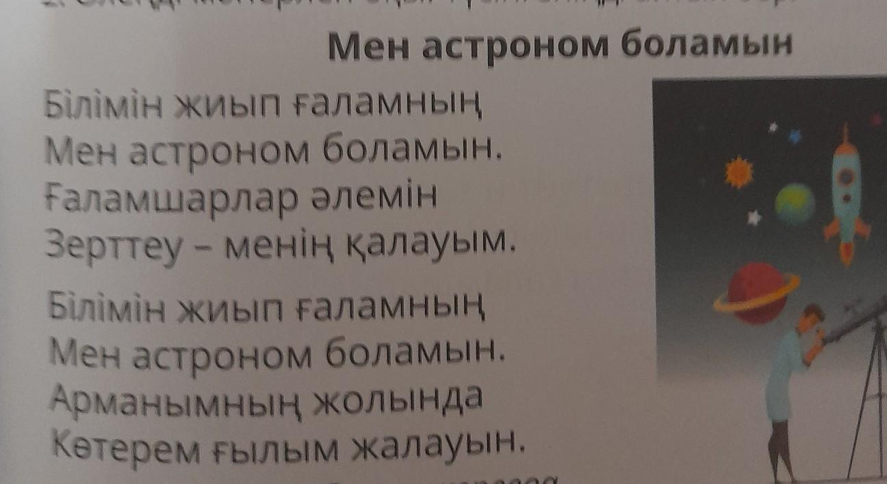 4. Өленді қайталап оқы. Сұрақтарға жауап бер. Өлең не туралы? Астроном болу үшін не істеу керек? Астроном адамдар немен айналысады? Астрономдар неліктен ғаламшарларды зерттейді? Өлеңдегі кейіпкер алдына кандай максат койды?