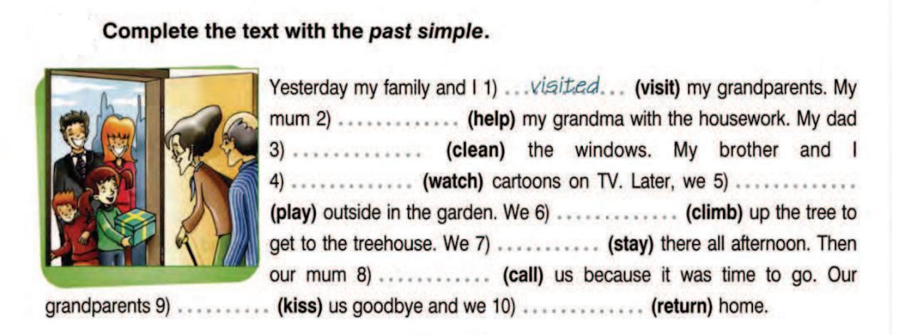Yesterday my family and I visited (visit) my grandparents. My mum helped (help) my grandma with the housework. My dad cleaned (clean) the windows. My brother and I watched (watch) cartoons on TV. Later, we played (play) outside in the garden. We climbed (climb) up the tree to get to the treehouse. We stayed (stay) there all afternoon. Then our mum called (call) us because it was time to go. Our grandparents kissed (kiss) us goodbye and we returned (return) home.