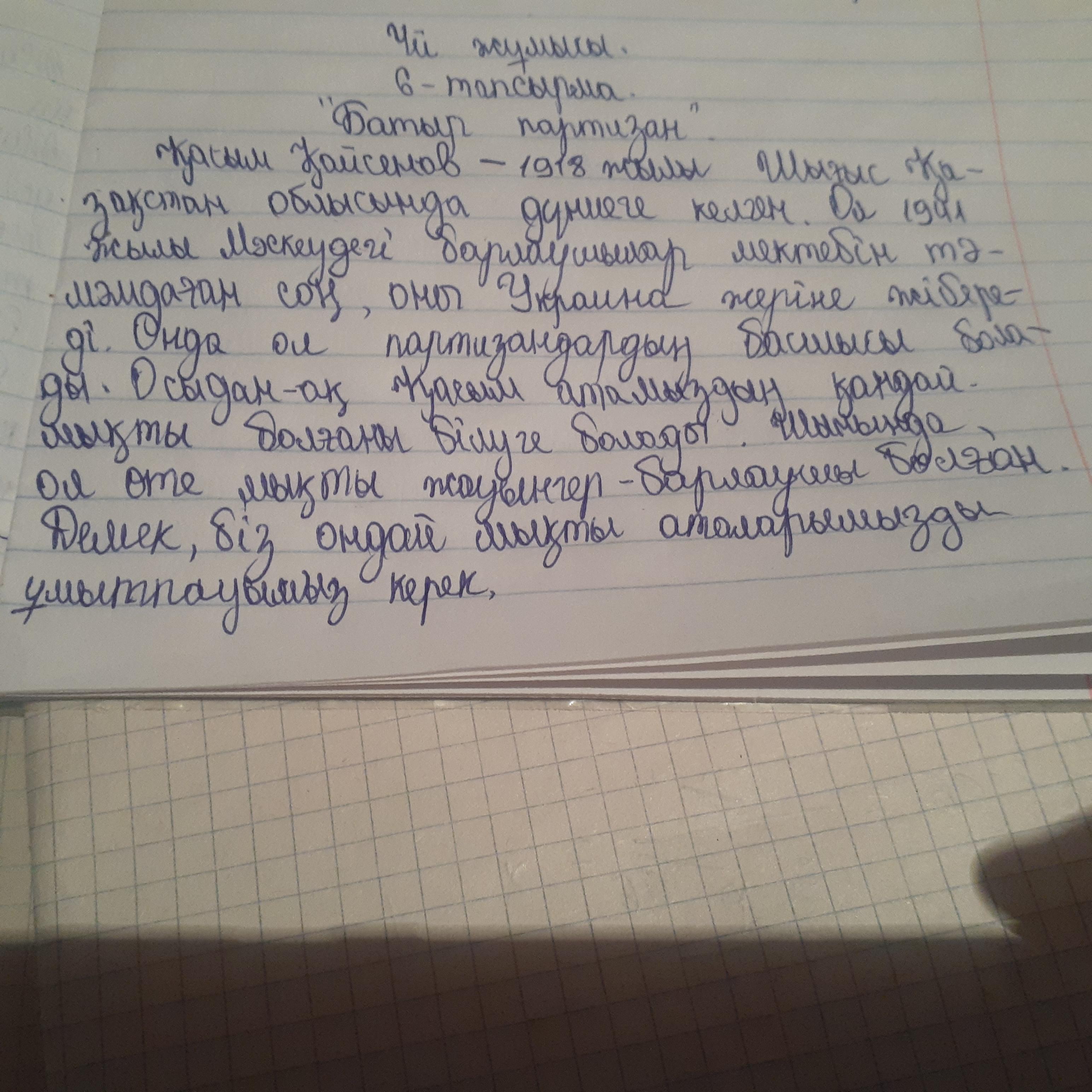 Үй тапсырмасы «Батыр партизан» мақал-мәтелдерді, тақырыбында Қасым Қайсеновтің бейнесін тұрақты тіркестер мен одағай сөздерді пайдалана отырып ашындар.