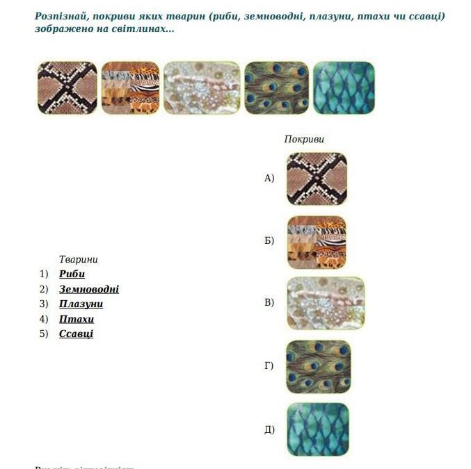 Розпiзнай, покриви яких тварин (риби, земноводнi, плазуни, птахи чи ссавцi) зображено на світлинах... Тварини 1) Риби 2) Земноводні 3) Плазуни 4) Птахи 5) Ссавцi