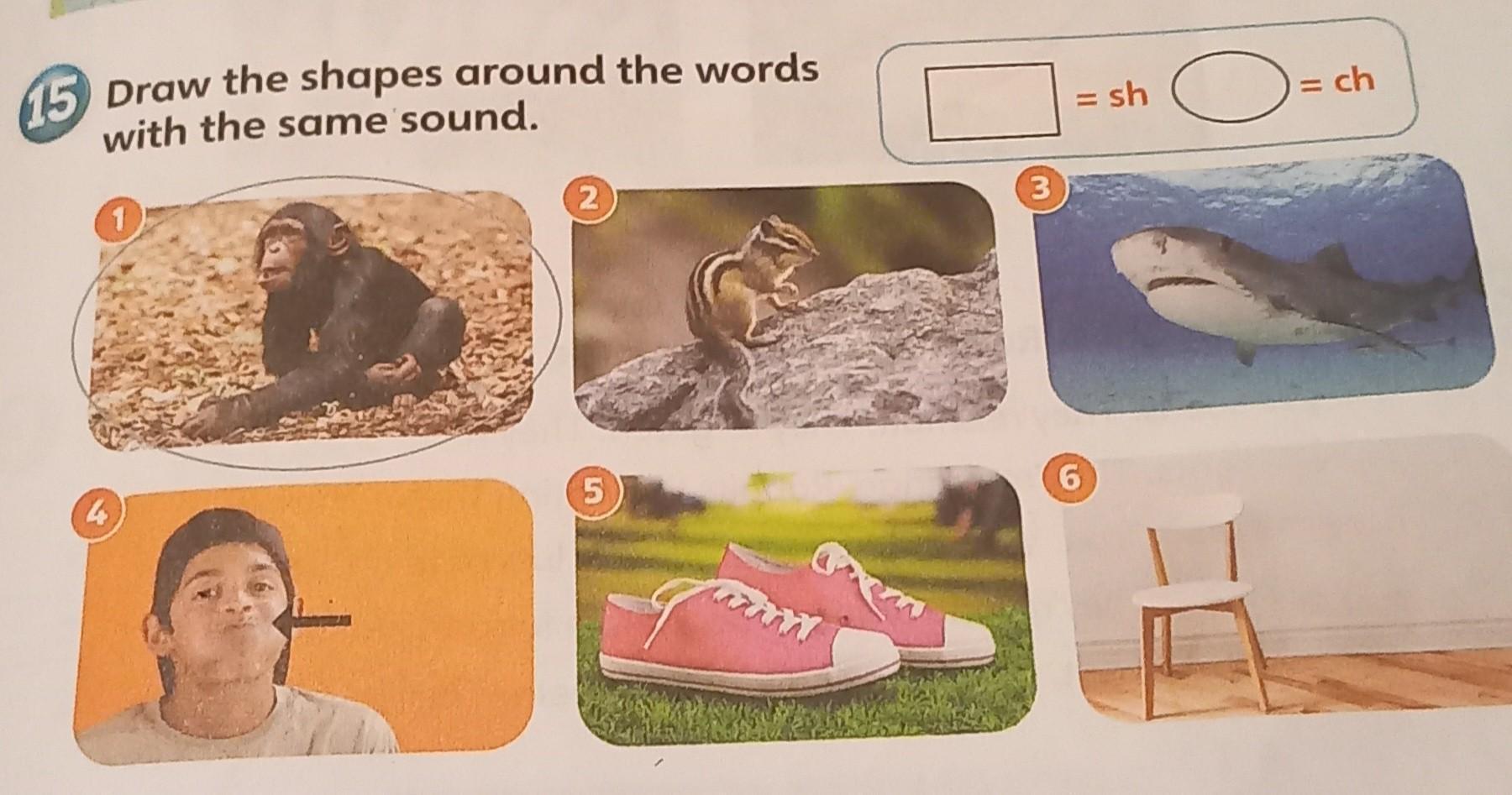 Нарисуйте фигуры вокруг слов с одинаковым звуком.
