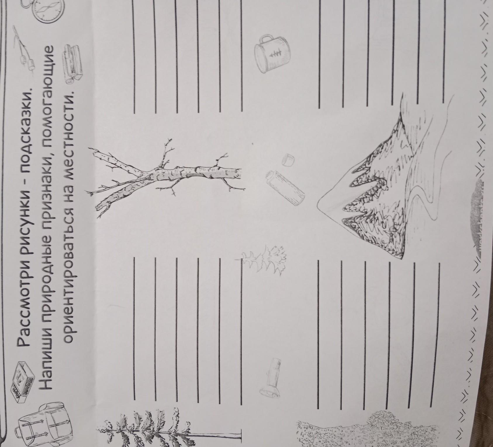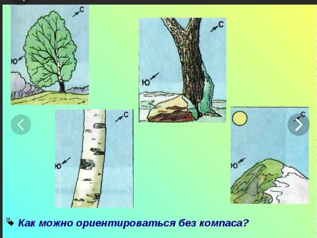 П Рассмотри рисунки - подсказки. Напиши природные признаки, помогающие ориентироваться на местности.