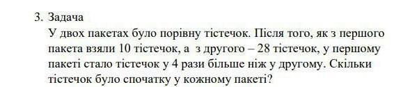 У двох пакетах було порiвну тістечок. Після того, як з першого пакета взяли 10 тістечок, а з другого - 28 тістечок, у першому пакетi стало тістечок у 4 рази більше ніж у другому. Скільки тістечок було спочатку у кожному пакеті?