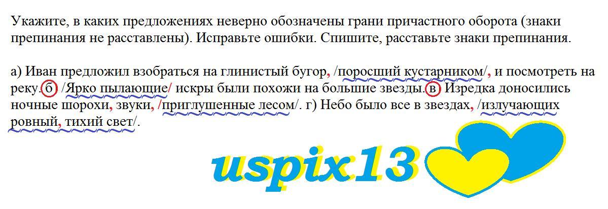 Задание 7. Укажите, в каких предложениях неверно обозначены грани причастного оборота (знаки препинания не расставлены). Исправьте ошибки. Спишите, расставьте знаки препинания. a) Иван предложил взобраться на глинистый бугор /поросший кустарником/ и посмотреть на реку. б) /Ярко пылающие искры/ были похожи на большие звезды. в) Изредка доносились ночные шорохи /звуки приглушенные лесом/. г) Небо было все в звездах /излучающих ровный тихий свет/.