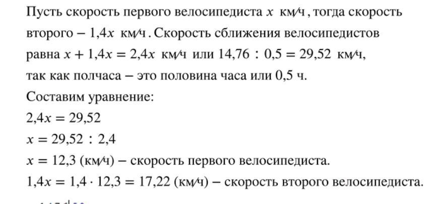 Из двух пунктов, расстояние между которыми 14,76 км, выехали два велоси- педиста и встретились через полчаса. Чему равны их скорости, если скорость одного в 1,4 раза меньше скорости другого?