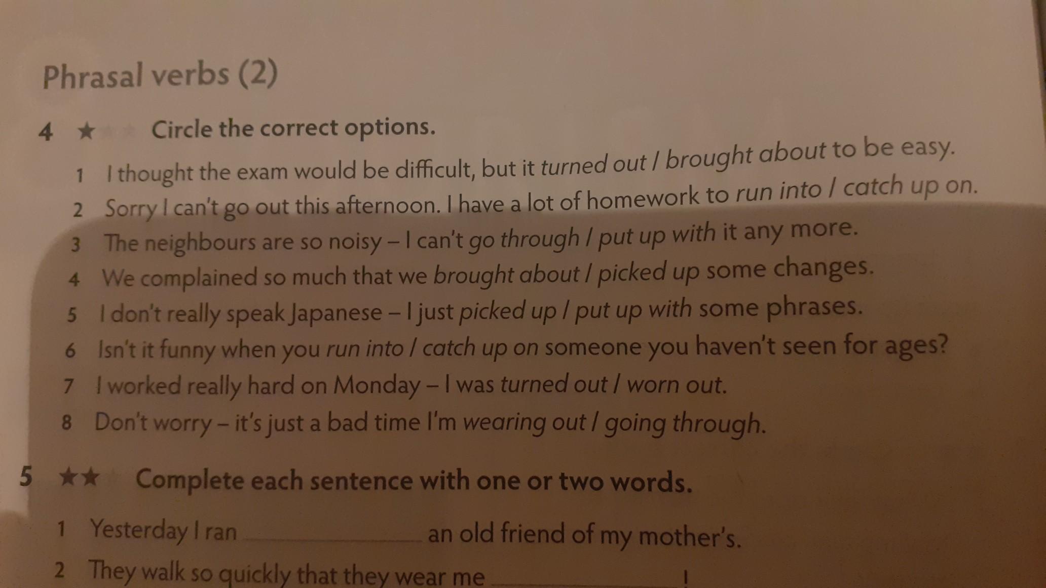 5. I don't really speak Japanese - I just picked up / put up with some phrases. 6 Isn't it funny when you run into / catch up on someone you haven't seen for ages?