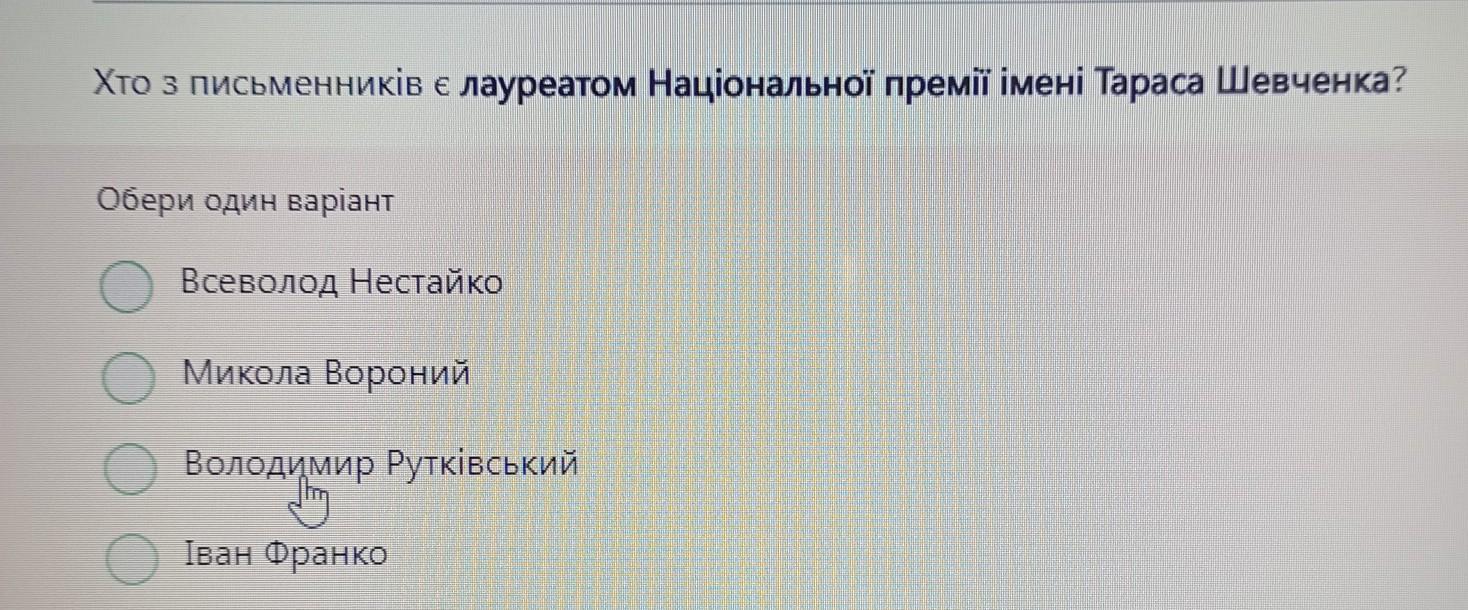 Хто з письменників є лауреатом Національної премії імені Тараса Шевченка? Обери один варіант Всеволод Нестайко Микола Вороний Володимир Рутківський Іван Франко