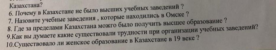 6. Почему в Казахстане не было высших учебных заведений ? 7. Назовите учебные заведения, которые находились в Омске ? 8. Где за пределами Казахстана можно было получить высшее образование ? 9.Как вы думаете какие существовали трудности при организации учебных заведений? 10.Существовало ли женское образование в Казахстане в 19 веке ?