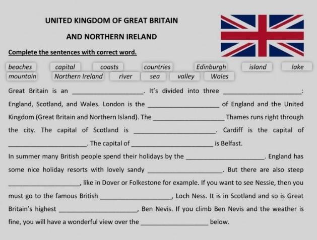 1. island; 2. countries; 3. capital; 4. river; 5. Edinburgh; 6. Wales; 6. Northern Ireland; 7. sea; 8. beaches; 9. walley; 10. lake; 11. mountains; 12. coasts;
