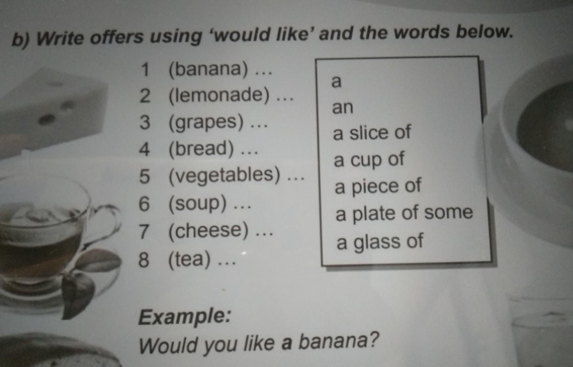 Write offers using 'would like' and the words below. 1 (banana)... 2 (lemonade)... 3 (grapes) ... 4 (bread)... 5 (vegetables) ... 6 (soup)... 7 (cheese)... 8 (tea)... a an a slice of a cup of a piece of a plate of some a glass of