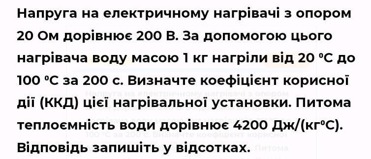 Напруга на електричному нагрівачі з опором 20 Ом дорівнює 200 В. За допомогою цього нагрівача воду масою 1 кг нагріли від 20 °C до 100 °С за 200 с. Визначте коефіцієнт корисної дії (ККД) цієї нагрівальної установки. Питома теплоємність води дорівнює 4200 Дж/(кг°С). Відповідь запишіть у відсотках.