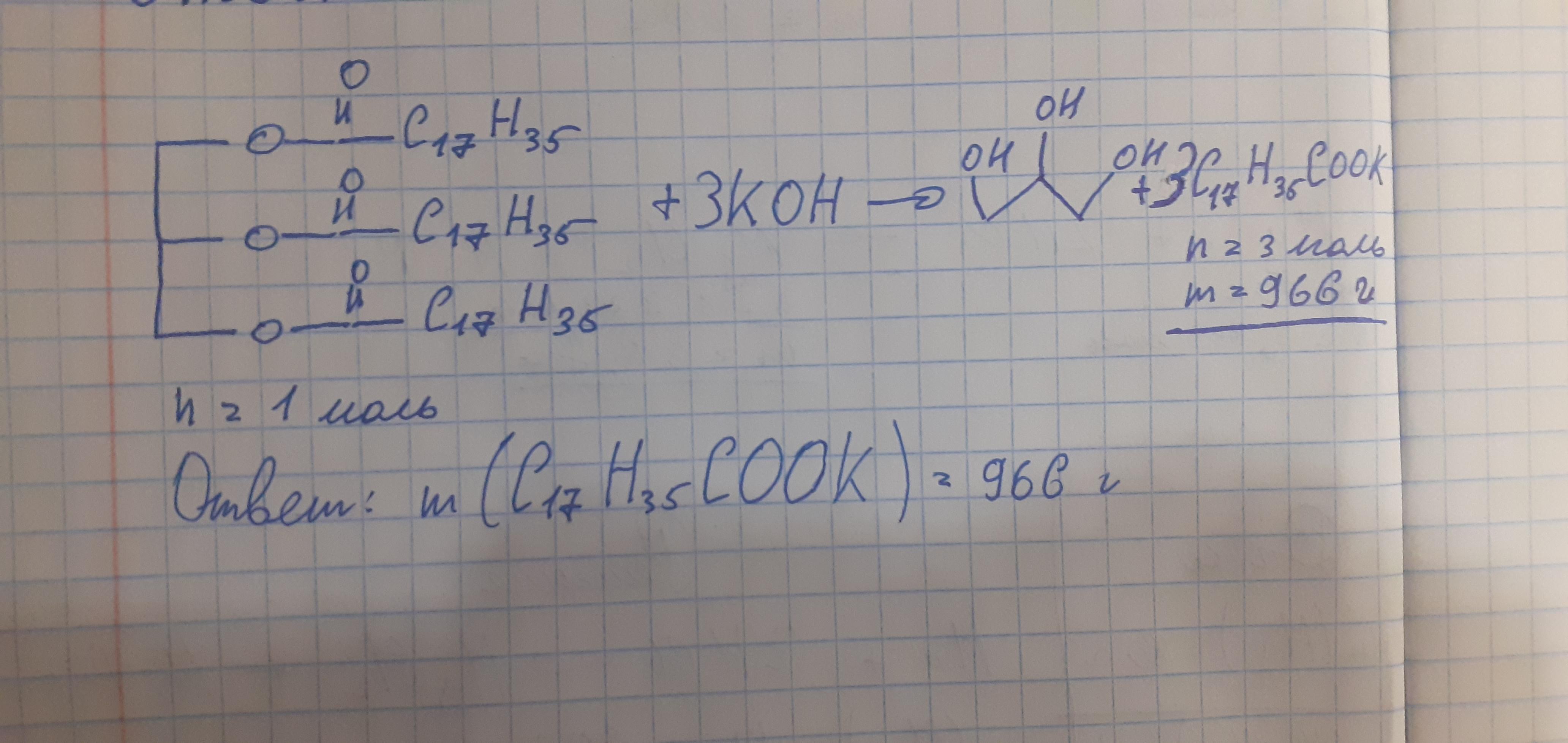 здесь илёт решение на стеарат калия, но я не могу утверждать, что этот ответ правильный, так как в задаче не сказано твёрдое или жидкое мыло мы получаем