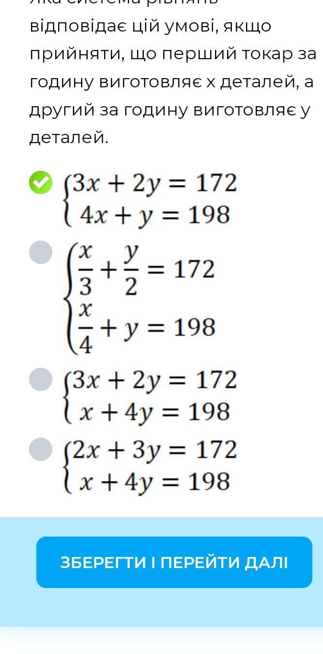 Два токарі виготовили 172 деталі, перший працював 3 год., а другий – 2 год. Якби перший працював 1 годину, а другий – 4 години, то вони виготовили б 198 деталей. Яка система рівнянь вiдповiдацій умові, якщо прийняти, що перший токар за годину виготовляє х деталей, а другий за годину виготовляє у деталей.