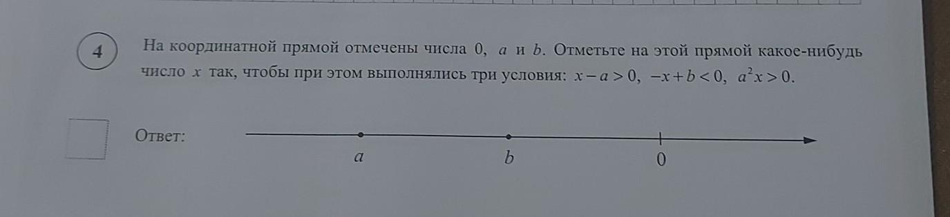 Число х правее числа а и b да и к тому же положительное. Этому условию удовлетворяет любое число от 0 не включительно до бесконечности, например, число 1, чуть правее 0 на прямой