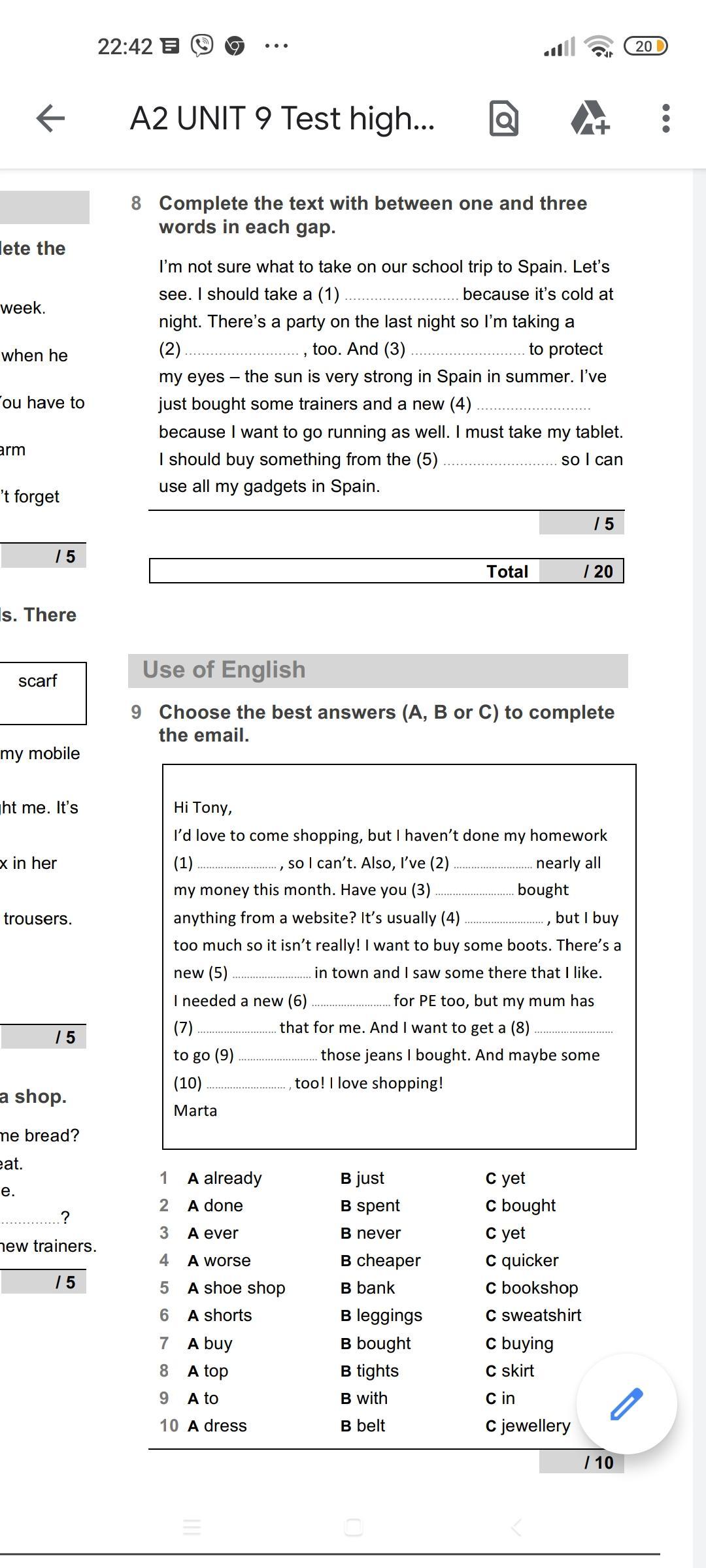 I'm not sure what to take on our school trip to Spain. Let's see. I should take a (1) jacket because it's cold at night. There's a party on the last night so I'm taking a (2) dress, too. And (3) sunglasses to protect my eyes - the sun is very strong in Spain in summer. I've just bought some trainers and a new (4) cap because I want to go running as well. I must take my tablet. I should buy something from the (5) website so I can use all my gadgets in Spain.